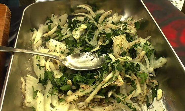Нарежьте лук перьями (вдоль волокон) и выложите в миску. Добавьте к луку соль, сахар, черный перец, прованские травы и мелко нарезанный чеснок, затем тщательно перемешайте. Мелко порубите свежую петрушку и отправьте её к луковой массе. Крабовые палочки нарежьте крупными брусочками (примерно на 4 части каждую), чтобы они хорошо чувствовались в закуске, и соедините с овощами.