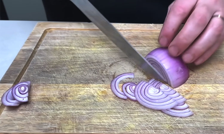 Отварите картофель в мундире в несоленой воде до готовности, проверьте её ножом — если картофелина сама соскальзывает с лезвия, пора сливать воду. Очистите картофель, пока он еще горячий, и нарежьте кружочками толщиной около 5 мм. Лук нарежьте тонкими полукольцами, стараясь не давить его ножом, чтобы сохранить сок внутри.