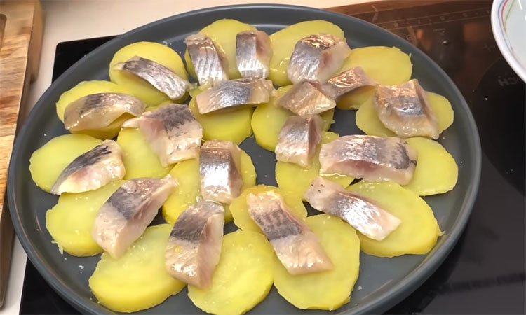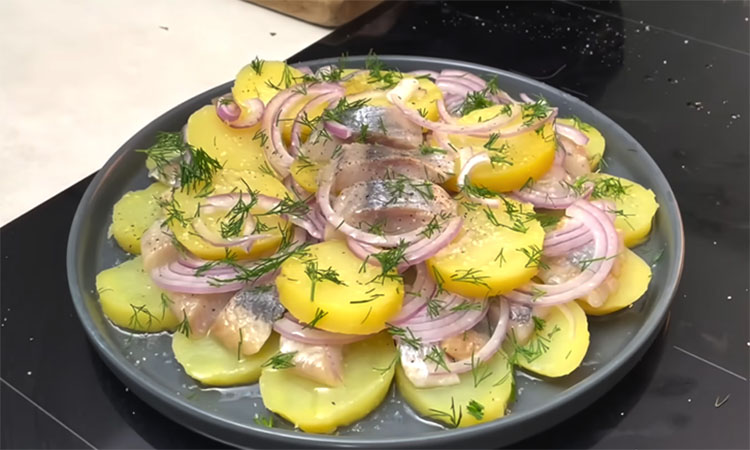 Подготовьте филе сельди: очистите от кожи и костей, нарежьте ломтиками, подходящими по размеру к кусочкам картофеля. Начните собирать блюдо слоями: выложите теплый картофель, слегка посолите его и поперчите. Сверху разложите ломтики сельди, а затем обильно засыпьте всё луком.