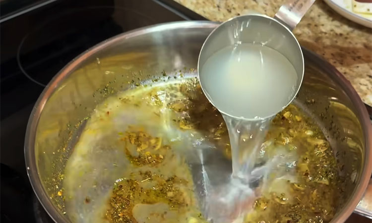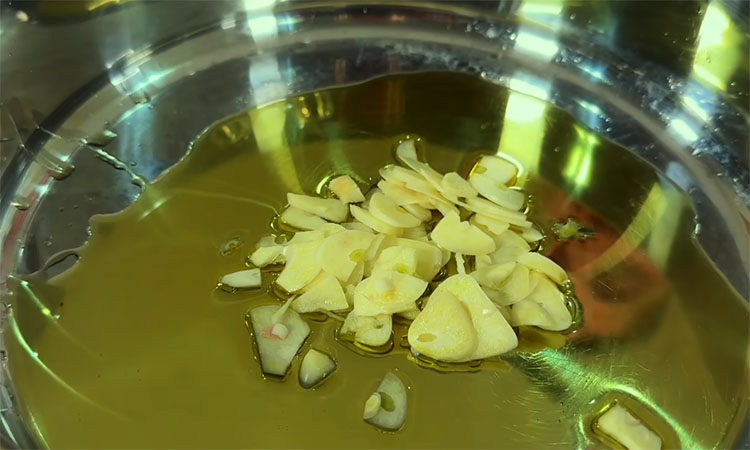 Поставьте вариться макароны в большой кастрюле с хорошо соленой водой и варите их на пару минут меньше, чем указано на пачке. Нарежьте чеснок тонкими дольками и положите в холодную сковороду с оливковым маслом, добавьте веточки тимьяна с розмарином и начните медленно нагревать.