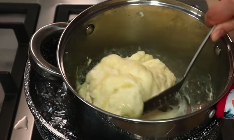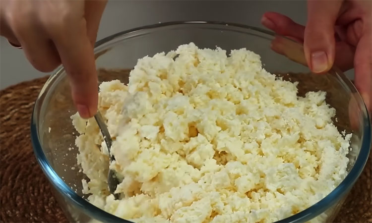 Сначала измельчите творог вилкой, чтобы убрать крупные комки, и доведите молоко в кастрюле до момента закипания. Как только молоко закипит, всыпьте в него весь творог и проварите на небольшом огне около трех минут до четкого отделения желтоватой сыворотки. Откиньте массу на дуршлаг, дайте жидкости полностью стечь в течение нескольких минут, после чего переложите горячий уплотнившийся творог в емкость с толстым дном.