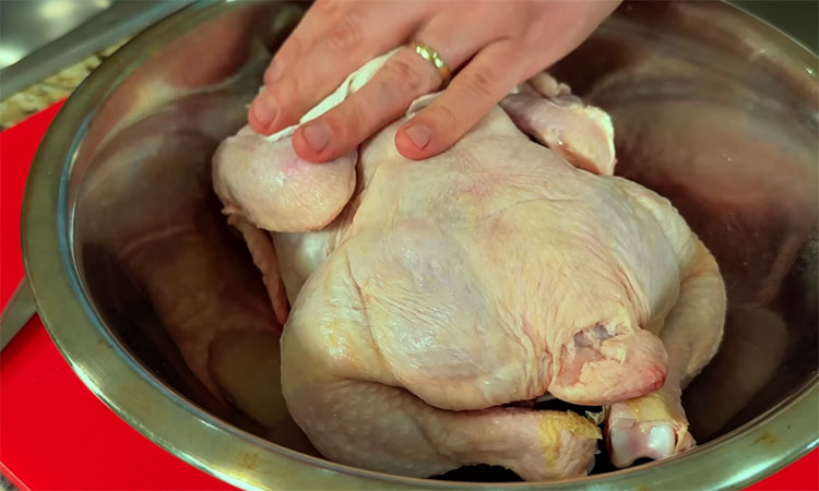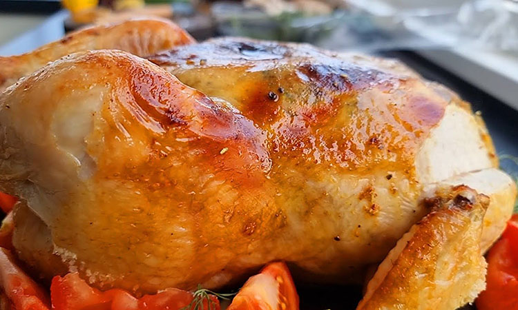 В процессе можно пару раз полить курицу выделившимся соком. Готовность проверяйте по температуре в самой толстой части — она должна быть минимум 82 градуса. Перед нарезкой дайте курице отдохнуть 10 минут, чтобы соки распределились внутри.