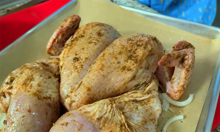 Для начала подготовьте курицу. С помощью кухонных ножниц вырежьте хребет — режьте вдоль кости с обеих сторон. Хребет не выбрасывайте, он отлично подойдет для наваристого бульона. Переверните курицу грудкой вверх, немного надрежьте хрящ посередине изнутри и сильно придавите ладонью, чтобы тушка стала плоской. Обязательно обсушите мясо бумажными полотенцами, чтобы специи лучше легли, а кожа стала хрустящей.