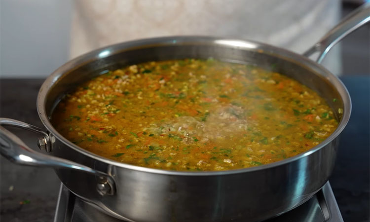 Тщательно перемешайте и продолжайте жарить на сильном огне. Сначала выделится влага, ее нужно полностью выпарить. После этого жарьте мясо еще примерно пять минут, пока на фарше не появятся поджаристые румяные кусочки. Затем всыпьте в сковороду рис, который нужно предварительно промыть в нескольких водах до прозрачности. Сразу добавьте соль, любимые специи и рубленую зелень. Все хорошо перемешайте, чтобы рис соединился с мясом и овощами. Залейте содержимое сковороды горячим бульоном так, чтобы жидкость слегка покрывала рис.