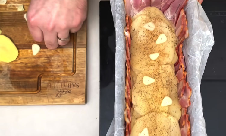 Когда форма будет заполнена, накройте картофель свисающими краями бекона, «запечатывая» его внутри. Сверху можно прикрыть бумагой для запекания, чтобы бекон не подгорел раньше времени. Отправляйте форму в духовку, разогретую до 210 градусов, на 45–50 минут.
