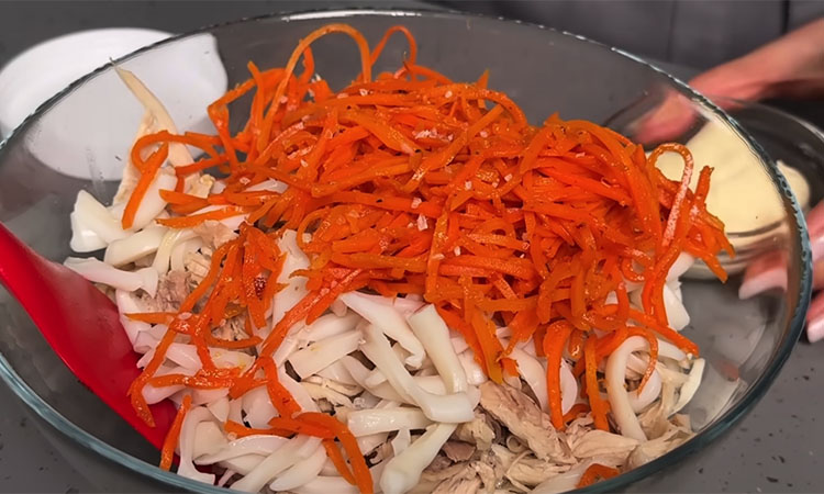 Нарежьте их тонкой соломкой. Добавьте в миску курицу, кальмары и корейскую морковь (лишнюю жидкость с моркови лучше заранее слить). Заправьте салат майонезом, при необходимости добавьте соль и черный перец по вкусу. Тщательно все перемешайте и дайте салату настояться буквально 15–20 минут перед подачей.