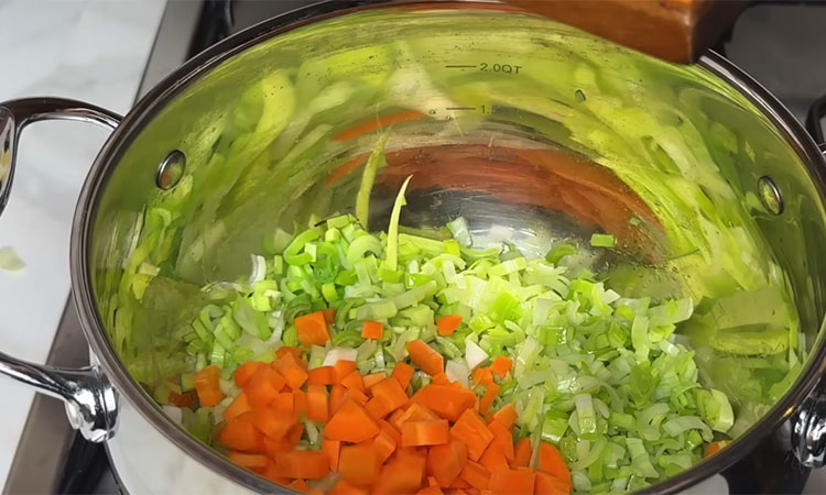 Подготовьте овощи для самого супа. Нарежьте картофель, корень сельдерея и морковь примерно одинаковыми средними кубиками. Лук-порей нарежьте тонкими кольцами. В глубокой сковороде или кастрюле с толстым дном разогрейте немного растительного масла и добавьте кусочек сливочного для нежного вкуса. Сначала спассеруйте лук-порей в течение минуты, затем добавьте морковь и сельдерей. Потомите овощи пару минут, закиньте картофель и обжаривайте всё вместе еще 2–3 минуты, постоянно помешивая.
