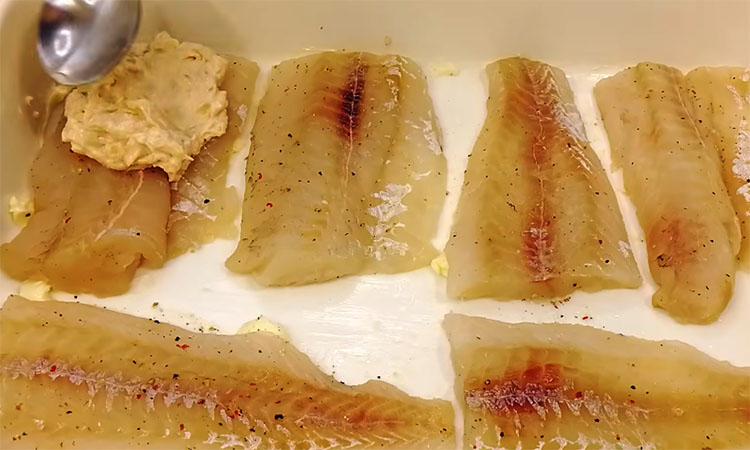 В миске соедините творожный сыр, две ложки майонеза и баночку икры минтая. Добавьте обжаренный лук и тертый твердый сыр. Все тщательно перемешайте до однородности. Солить эту смесь, скорее всего, не придется, так как икра и сыр уже содержат достаточно соли. Возьмите форму для запекания и щедро смажьте её дно и бортики сливочным маслом. Выложите кусочки промаринованного минтая в форму в один слой. Поверх каждого кусочка распределите подготовленную икорно-сырную массу.