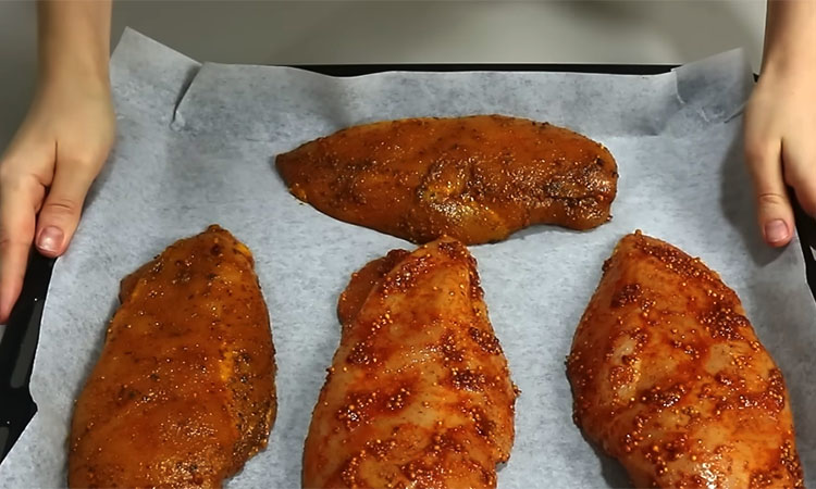 Паприка здесь очень важна — именно она даст мясу красивый цвет. Тщательно натрите филе маринадом со всех сторон. Если вы не использовали рассол, добавьте в маринад чайную ложку соли или 3 столовые ложки соевого соуса. Застелите противень качественным пергаментом или фольгой и выложите подготовленное мясо. Разогрейте духовку до очень высокой температуры — 220–230 градусов (если ваша духовка слабая, можно выставить 250). Поставьте противень в разогретую духовку ровно на 15 минут.