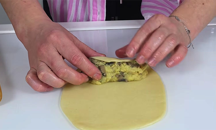 Выложите столовую ложку начинки на край, подверните бока и сверните плотную аккуратную трубочку. Укладывайте пирожки на противень, застеленный пергаментом.