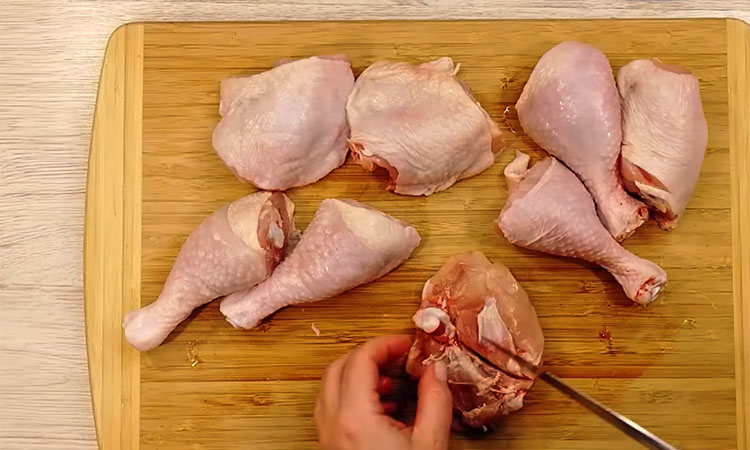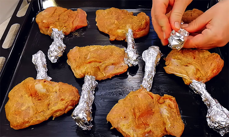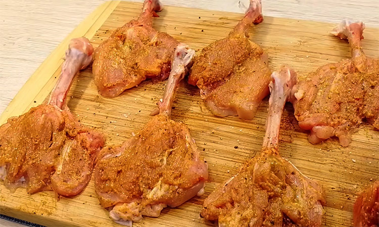 Возьмите куриные окорочка и разрежьте каждый на две части, чтобы у вас получились отдельно голени и бедра. С бедрышек аккуратно снимите кожу, сделайте глубокий надрез вдоль кости и немного освободите ее от мяса, но так, чтобы филе осталось держаться на одном конце. Точно так же поступите с голенью: надрежьте мясо вдоль, зачистите верх косточки и как бы выверните мясную часть наружу. Теперь каждый кусочек мяса хорошо посолите, добавьте черный перец, посыпьте сладкой паприкой и со всех сторон тщательно смажьте горчицей.