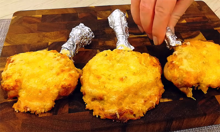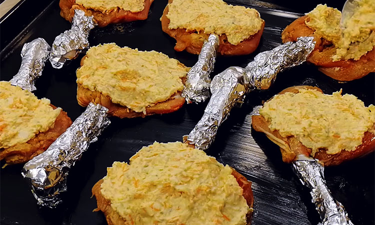 Смажьте противень небольшим кусочком сливочного масла, выложите на него подготовленное мясо косточками вверх и оберните каждую косточку маленьким кусочком фольги. На каждый кусок курицы положите сверху много сырной начинки, распределяя ее ровным толстым слоем.