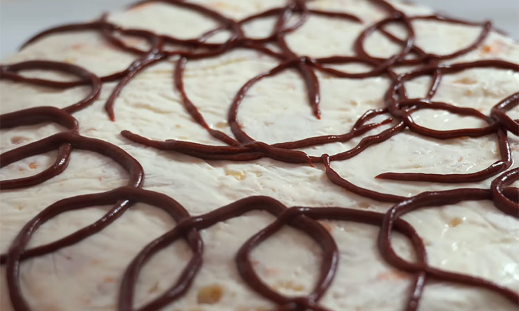 Оставьте торт в холодильнике минимум на шесть часов для полной пропитки. Перед подачей сварите глазурь, соединив сметану, сахар и какао, доведите до кипения и нанесите произвольные узоры на поверхность десерта.
