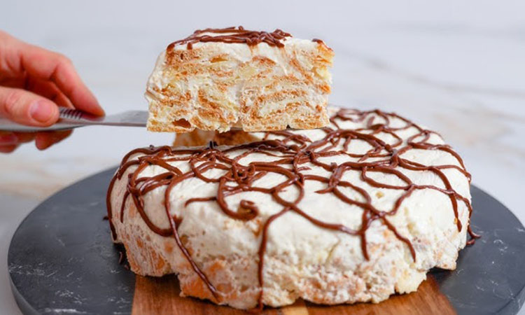 Подавайте этот изысканный торт охлажденным, когда заварные кусочки полностью объединятся со сметанным кремом в единую нежную текстуру.