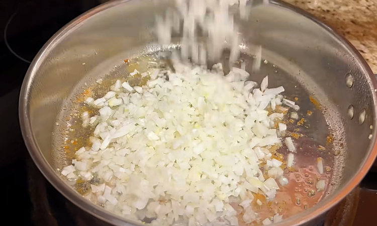 2. Разогрейте большую сковороду или сотейник с небольшим количеством масла на среднем огне. Сначала выложите лук и готовьте его 3–5 минут, помешивая, пока он не станет мягким и слегка прозрачным, без сильного зажаривания. Затем добавьте куски курицы в один слой и обжаривайте, периодически переворачивая, до появления румяной корочки со всех сторон. На этом этапе важно именно подрумянить мясо, а не довести до готовности. Готовую курицу переложите на тарелку, оставив соки и масло в сковороде.