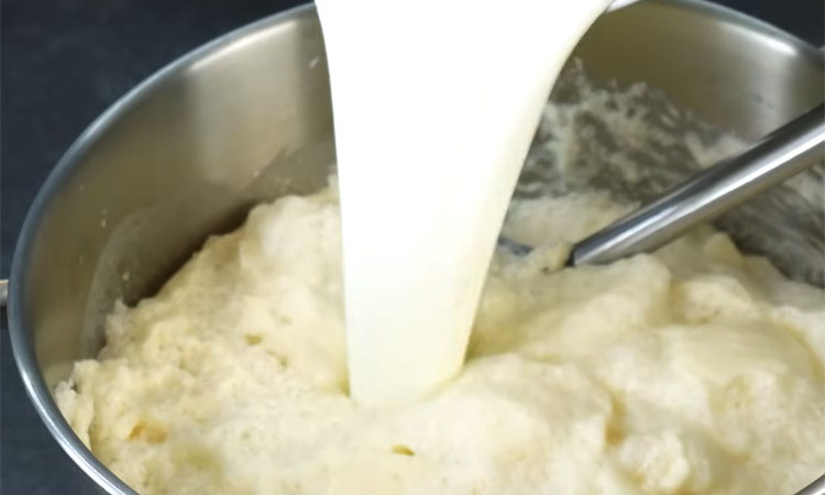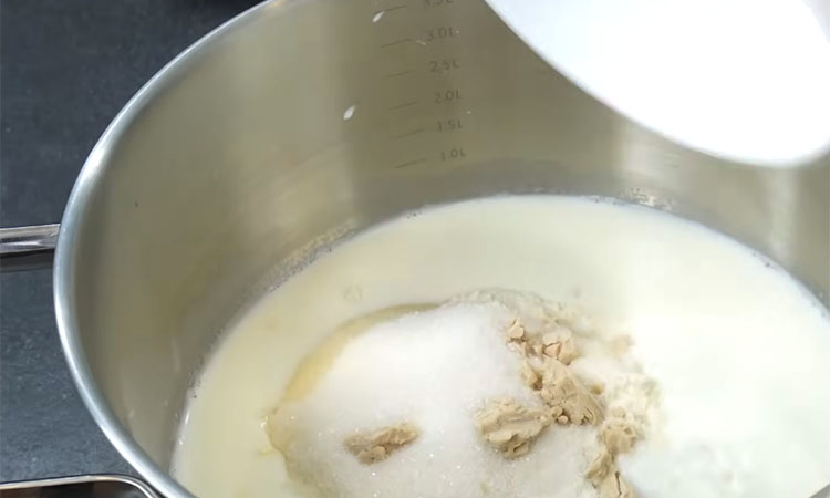 Сначала подогрейте 650 мл молока до чуть теплого состояния. Отлейте примерно 150 мл в отдельную емкость для опары. В эту часть молока добавьте 3 столовые ложки муки (из общего объема), 2 столовые ложки сахара и 15 г сырых дрожжей. Перемешайте и оставьте на 15–20 минут, чтобы дрожжи «ожили» и появилась пена.