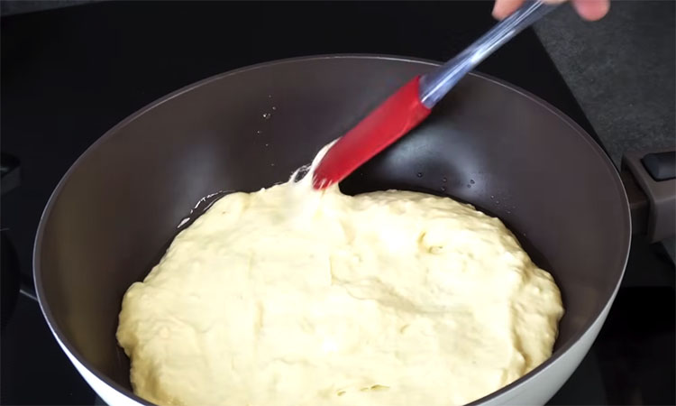 Когда тесто подойдет, разогрейте сковороду, добавив буквально одну столовую ложку растительного масла. Выкладывайте тесто половником, аккуратно распределяя по дну.