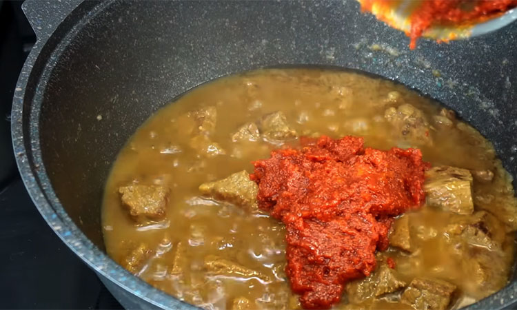 Посолите (1 ч. л.), влейте воду так, чтобы она была выше уровня мяса примерно на 3–5 см. Накройте крышкой и тушите на среднем огне около 50 минут до полной мягкости говядины. Пока мясо тушится, приготовьте «бархатную» основу: в сотейнике разогрейте 3–4 ст. л. растительного масла и растопите 30 г сливочного. Добавьте томатную пасту и немного её прожарьте.