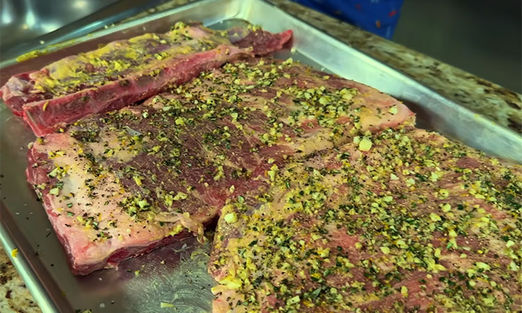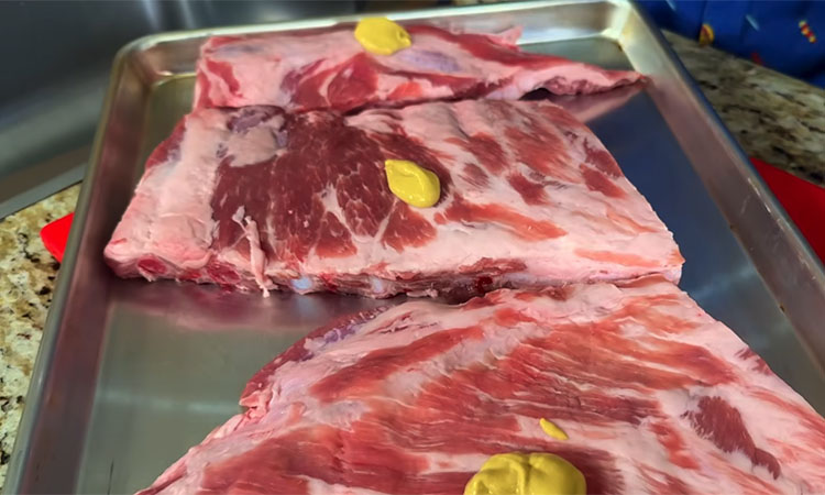 Смажьте ребра тонким слоем дижонской горчицы с обеих сторон, обильно посолите и поперчите по вкусу. Равномерно распределите чесночно-травяную смесь по мясу.