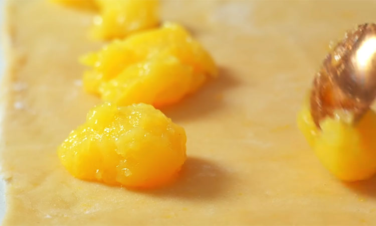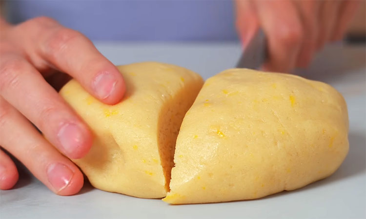 Для теста в глубокой миске соедините одно яйцо, сахар, ванильный сахар, щепотку соли, оставшуюся лимонную цедру и растительное масло. Постепенно всыпьте муку с разрыхлителем и замесите мягкое тесто. Разделите получившийся комок на две равные части: одну оберните пленкой и уберите в морозилку на 15 минут, а вторую сразу раскатайте на пергаменте в квадрат толщиной около 5 миллиметров.