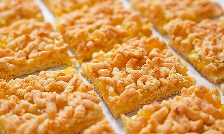 Равномерно распределите остывший лимонный крем по поверхности теста. Достаньте из морозилки вторую часть теста и натрите её на крупной терке прямо поверх начинки, равномерно покрывая весь слой.