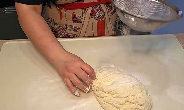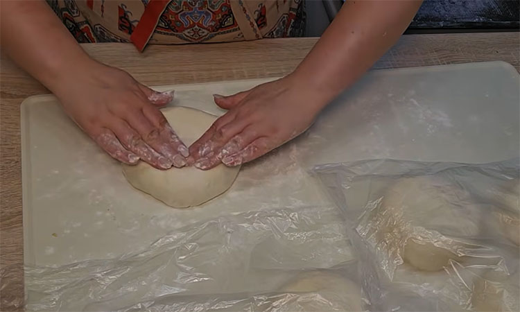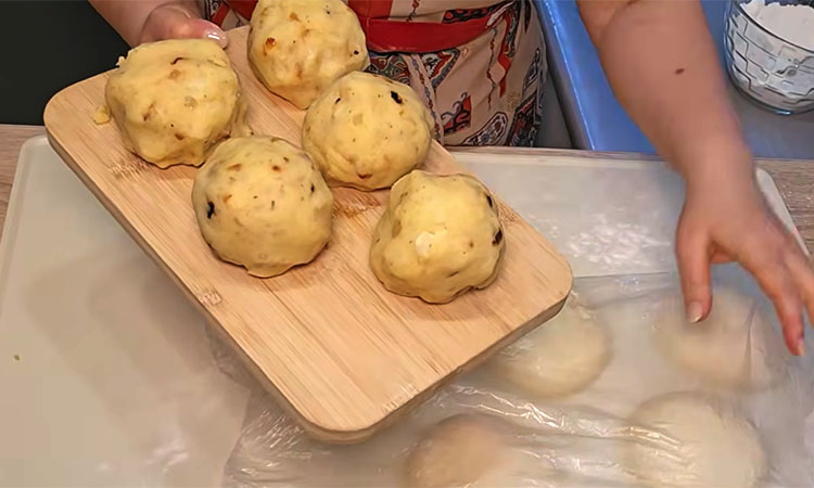 Разделите начинку на порции по 200-230 грамм и скатайте в колобки. Разделите подошедшее тесто на такие же части, сформируйте шарики и дайте им отдохнуть под пленкой 15 минут. Растяните края шарика теста, поместите в центр колобок начинки и защипните края сверху. Переверните заготовку швом вниз, аккуратно расплющите в лепешку и оставьте на расстойку на 20 минут.