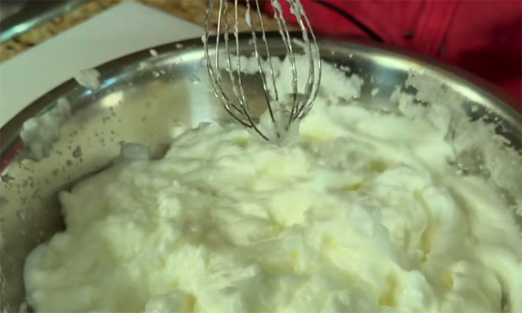Старайтесь не мешать слишком долго, чтобы сохранить пузырьки воздуха. Перелейте полученную воздушную смесь в подготовленную теплую форму. Учтите, что омлет сильно поднимется, поэтому у бортиков должно остаться несколько свободных сантиметров.