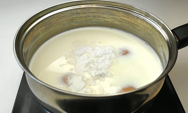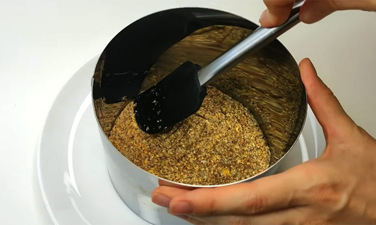 Тщательно взбейте массу венчиком и поставьте на медленный огонь. Варите крем при постоянном помешивании до легкого загустения — как только венчик начнет оставлять четкие следы на поверхности, сразу снимайте с плиты. Важно не переварить крем, чтобы он остался нежным. Остужать его не обязательно. Для формирования нижнего коржа в отдельной миске смешайте две столовые ложки обжаренной овсянки и две столовые ложки горячего крема.