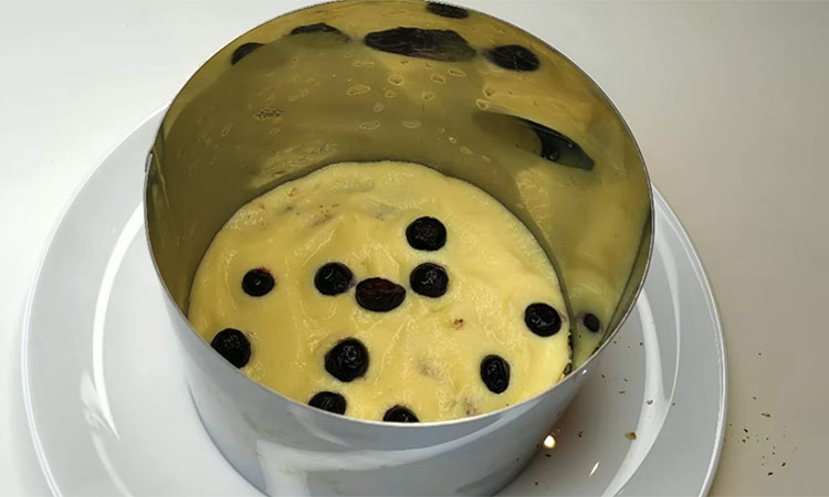 Выложите эту массу на дно формы (диаметром около 14 см) и плотно утрамбуйте — это создаст плотную основу, которая не даст торту развалиться. Сверху насыпьте пару ложек сухой овсяной смеси. Далее соберите торт слоями: на сухую овсянку аккуратно распределите часть крема, стараясь не тянуть за собой нижний слой, затем выложите ягоды.