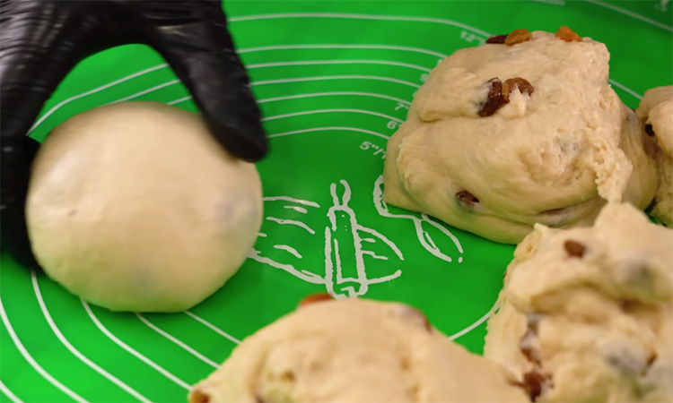 В конце добавьте ложку растительного масла, соберите тесто в шар и оставьте в теплом месте на 30-40 минут. Подготовьте изюм: залейте его горячей водой на 5-10 минут, промойте, обсушите полотенцем и смешайте с чайной ложкой муки. Обомните подошедшее тесто, вмешайте в него изюм и снова оставьте для подъема еще на 30-40 минут. Когда тесто станет очень воздушным и пузырчатым, разделите его на равные части (из данных пропорций получится примерно 7 саек весом по 185 г).