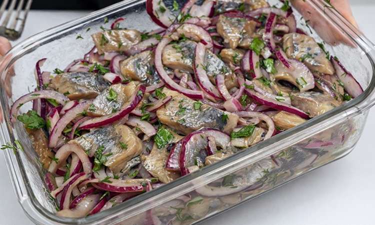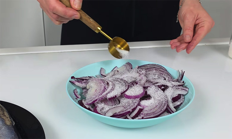 Нарежьте лук тонкими полукольцами и переложите в миску. Добавьте по чайной ложке соли и сахара, влейте уксус и воду в пропорции 50/50 (около 60 мл каждого). Тщательно перемешайте и оставьте на 15–20 минут, чтобы из лука ушла горечь и он стал приятно сладковатым. Подготовьте рыбу: если у вас целые тушки, удалите внутренности, снимите тонкую верхнюю пленку (кожицу) и отделите филе от хребта, убирая лишние косточки.