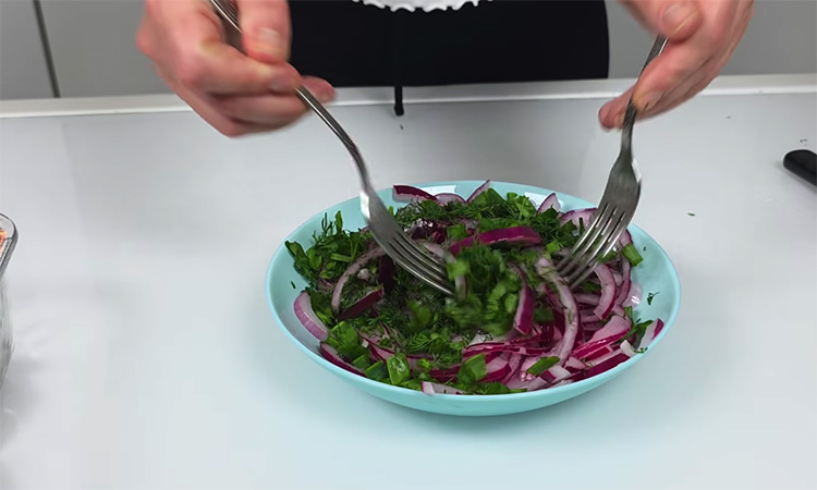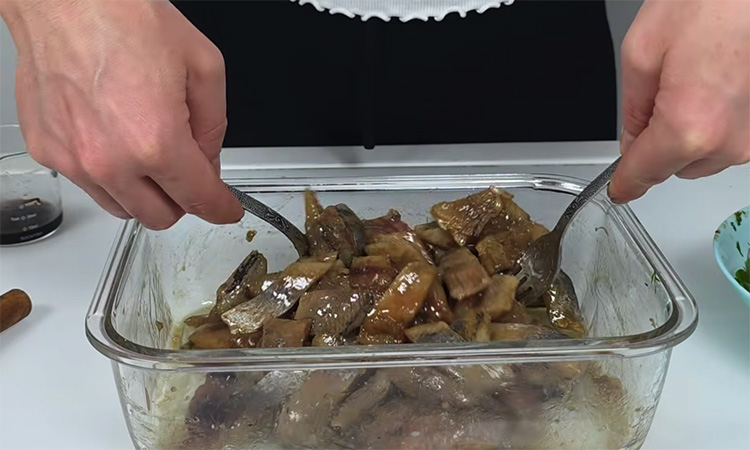 Теперь приступайте к заправке рыбы: сначала влейте к сельди 1–1.5 ст. л. соевого соуса и перемешайте, чтобы рыба приобрела легкий коричневатый оттенок. Затем добавьте растительное масло, которое обволочет кусочки, и в конце влейте еще чайную ложку соевого соуса для финального вкуса. Соедините рыбу с ароматным луком и зеленью, аккуратно все перемешайте. Дайте закуске настояться хотя бы 10 минут перед подачей, чтобы все вкусы соединились.