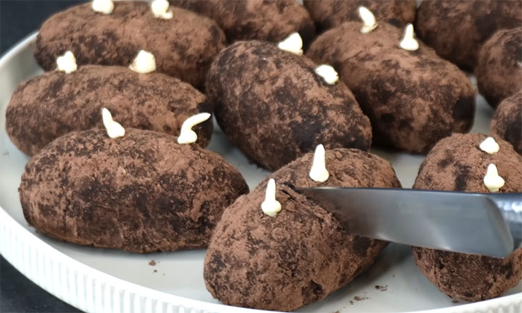 Обваляйте каждое в смеси какао и сахарной пудры. С помощью шпажки сделайте небольшие углубления и заполните их отложенным кремом, имитируя ростки картофеля.