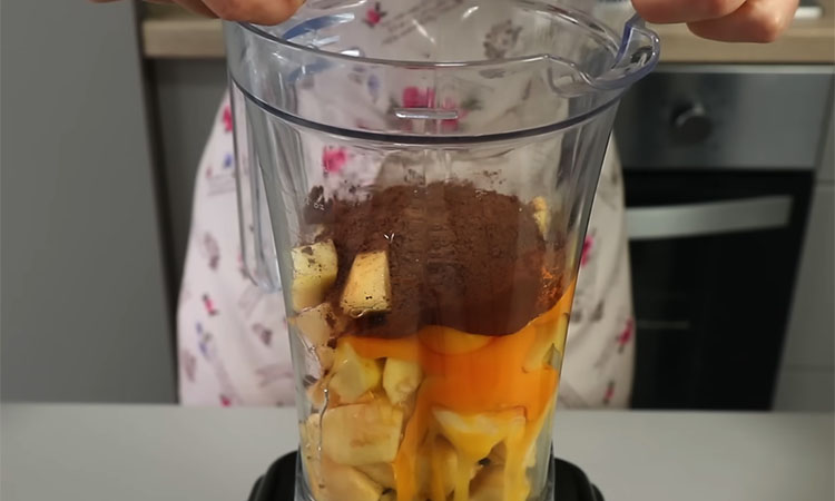Добавьте четыре яйца, четыре столовые ложки какао без горки, одну чайную ложку разрыхлителя и щепотку ванилина для аромата. По желанию можно добавить корицу. Измельчите все ингредиенты до состояния абсолютно гладкой, однородной массы без комочков. Подготовьте форму для выпечки (силиконовую, керамическую или стеклянную). Смажьте дно и бока тонким слоем растительного масла без запаха. Перелейте яблочно-шоколадную смесь в форму — консистенция теста будет довольно жидкой.