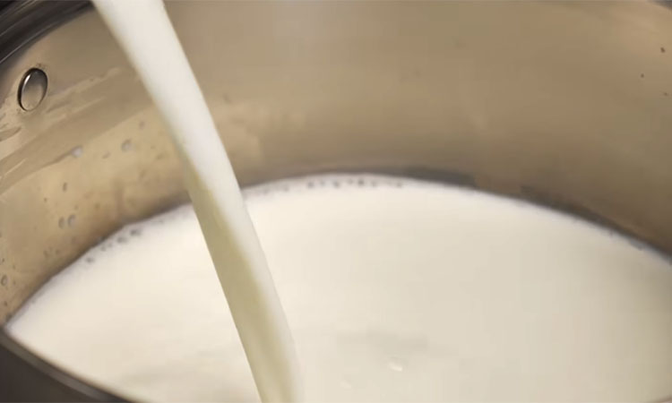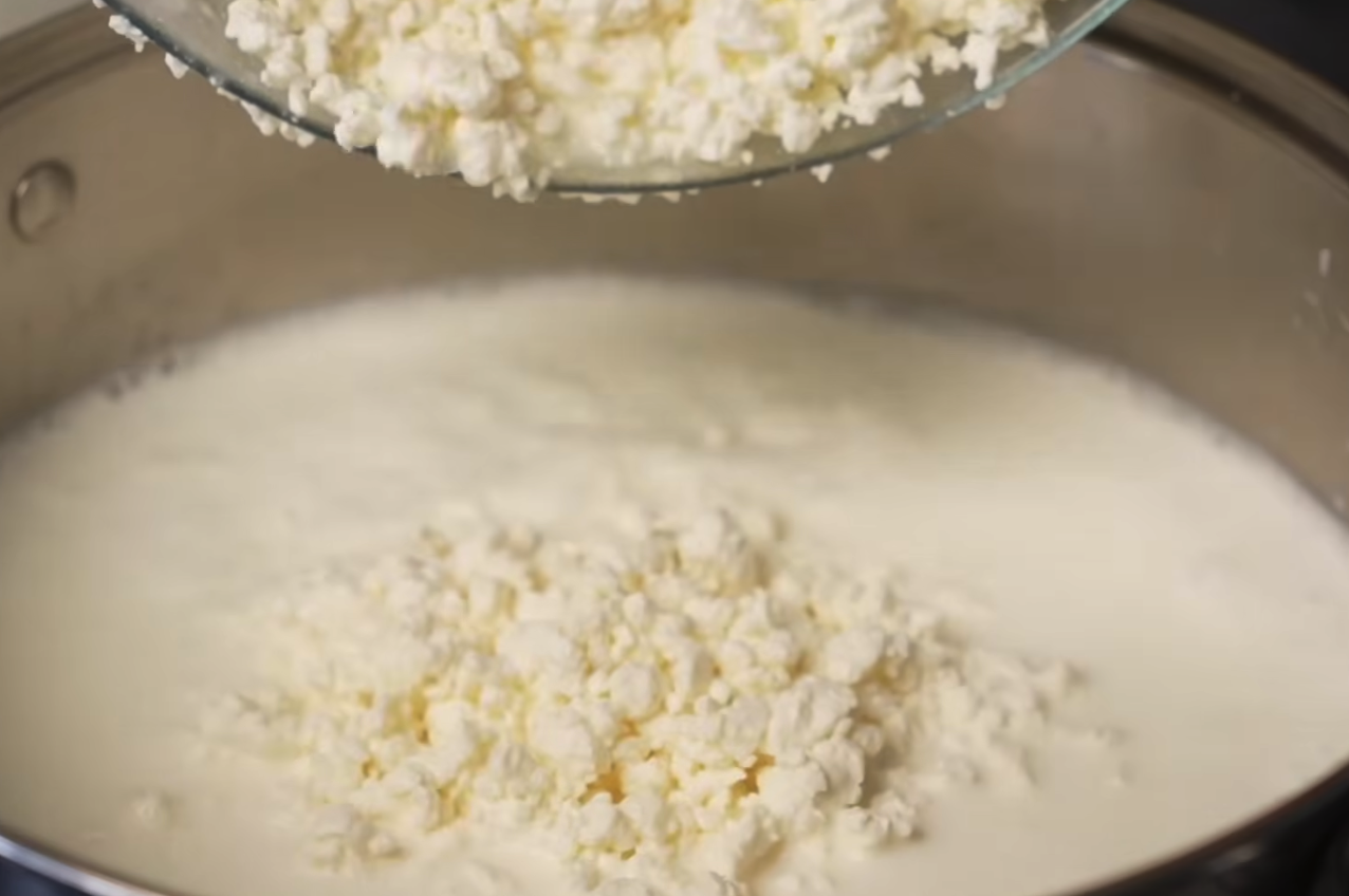 Выберите большую кастрюлю, поставьте ее на огонь и налейте один литр молока. Начинайте нагрев и доведите молоко до кипения. Важно заранее подготовить творог, лучше всего использовать продукт жирностью 9%. Как только молоко начнет закипать, аккуратно переложите в него весь объем творога. На этом этапе необходимо постоянно помешивать массу лопаткой или ложкой, чтобы она не пригорела к дну кастрюли.