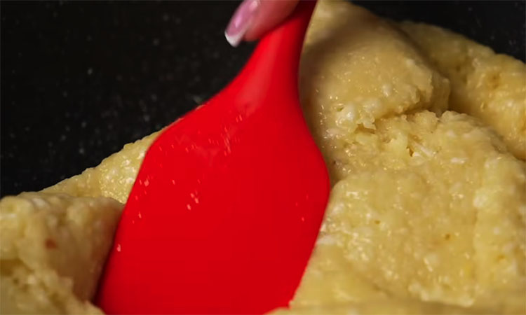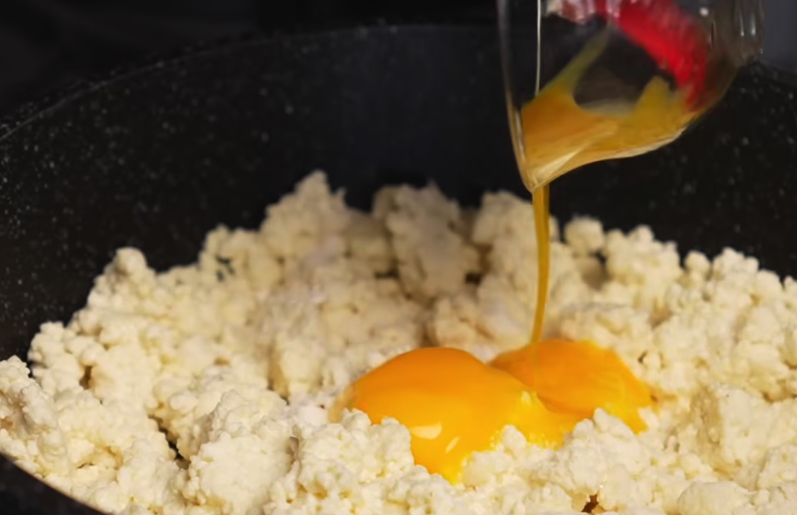Сразу же введите три яичных желтка (использование только желтков вместо целых яиц дает более нежный вкус и насыщенный цвет). Тщательно все перемешайте. Продолжайте нагревать массу на очень медленном огне (например, на уровне 3 из 9). Постоянно помешивайте, чтобы творог не пригорел. Постепенно масса начнет плавиться, крупинки исчезнут, и она станет тягучей и пластичной.