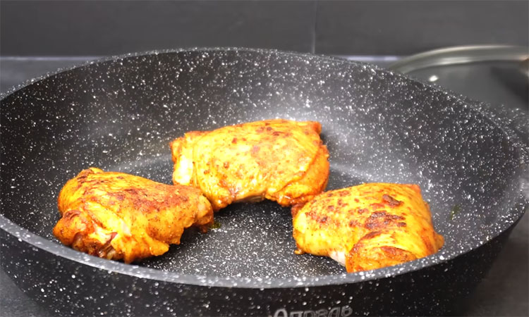 Промойте куриные бедра под холодной водой и тщательно обсушите их бумажными полотенцами, чтобы специи лучше легли на кожу. Добавьте к мясу одну чайную ложку соли, одну чайную ложку сладкой паприки, половину чайной ложки черного перца и половину чайной ложки куркумы. Тщательно натрите бедра этой смесью со всех сторон и оставьте их в сторонке на время подготовки овощей. Нарежьте две средние моркови аккуратной соломкой, а репчатый лук порежьте четверть кольцами. Разогрейте сковороду с растительным маслом и обжарьте замаринованные куриные бедра на сильном огне до появления интенсивного золотистого цвета с двух сторон.