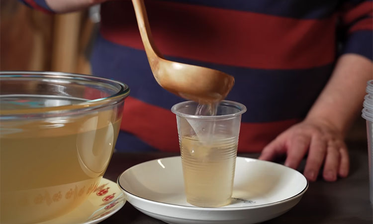 Продолжайте варить на самом медленном огне еще один час, следя за тем, чтобы не было активного бурления. Процедите готовый горячий бульон через плотную безворсовую ткань или специальное полотенце для идеальной очистки. Дайте жидкости немного остыть, а затем разлейте ее по порционным контейнерам или стаканам. Уберите заготовку в морозильную камеру для длительного хранения или используйте в течение трех дней из холодильника.