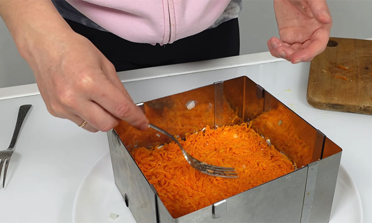 Сверху распределите рыбную массу ровным слоем, на которую выложите подготовленный маринованный лук и добавьте немного майонеза. Следующим этапом натрите на мелкой терке морковь, присолите ее для яркости вкуса и покройте слоем соуса. Для сырного акцента натрите на мелкой терке смесь плавленого и твердого сыра, распределите поверх моркови и добавьте майонез, стараясь не приминать массу ложкой.