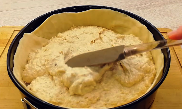Перелейте готовую массу в форму на подготовленное тесто, разровняйте поверхность и при необходимости подрежьте края теста, чтобы пирог выглядел аккуратно.