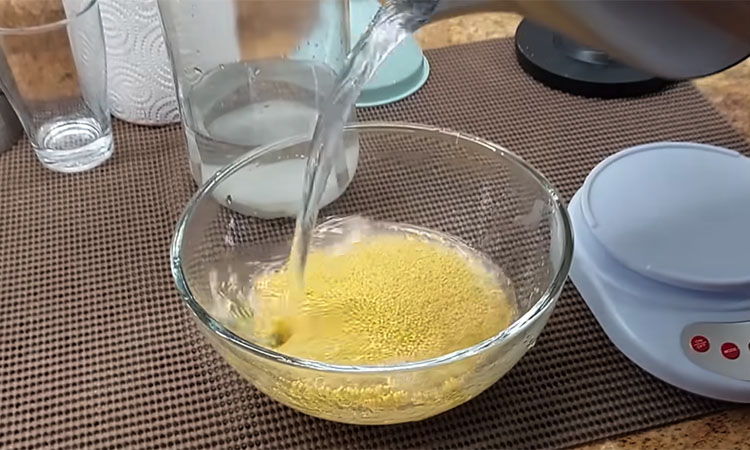 Тщательно промойте пшено, обдайте его кипятком пару раз, затем залейте горячей водой и оставьте набухать на всю ночь. Утром максимально тщательно слейте всю воду с подготовленной крупы. Разогрейте духовку до 180 градусов. Добавьте к пшену два яйца, кефир и растительное масло.