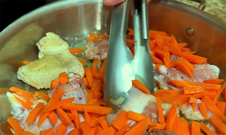 Нарежьте морковь соломкой, а лук (предварительно охлажденный для удобства нарезки) — кубиком. Обжарьте лук на сковороде с высокими бортиками до золотистого цвета, затем временно уберите его со сковороды. На этой же сковороде в смеси растительного и сливочного масел начните обжаривать морковь. Приправьте части курицы солью и перцем.
