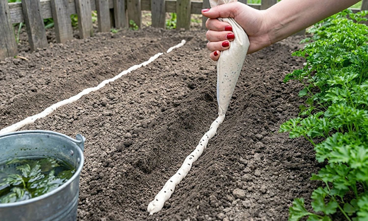 Смешайте набухшие семена петрушки с остывшим мучным клейстером. Перелейте смесь в пластиковый пакет и отрежьте у него маленький уголок. Посадка в грунт: сделайте на грядке бороздки глубиной около 1 см (петрушку нельзя сажать глубоко). Расстояние между рядами должно быть 20–30 см. Медленно выдавливайте смесь из пакета в бороздку — это обеспечит равномерное распределение семян и избавит от необходимости прореживать всходы.
