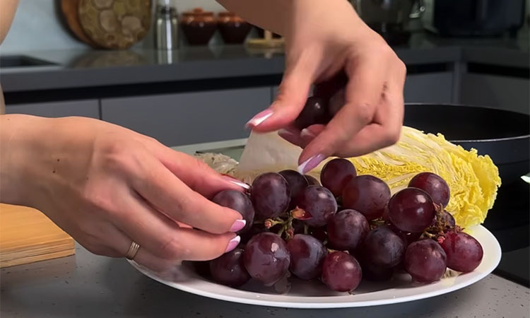 Пекинскую капусту разрежьте вдоль на четыре части, а затем нашинкуйте ее не слишком мелко и отправьте в глубокий салатник. Сладкий красный виноград нужно разрезать на четвертинки, при этом обязательно удалите косточки, чтобы они не мешали наслаждаться вкусом, и добавьте его к капусте.