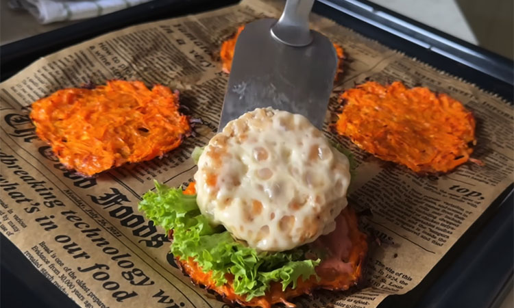Приготовить привычный бургер можно и так, чтобы он вписался в любую диету. Просто нужно убрать из него самое вредное и калорийное, муку и само тесто. Вместо них даже вкуснее будет взять особенные лепешки из моркови и сыра: сочетание нежного куриного филе, расплавленного сыра и пикантного соуса на йогурте делает вкус максимально близким к классическому фастфуду, но без лишних углеводов и тяжести в животе.