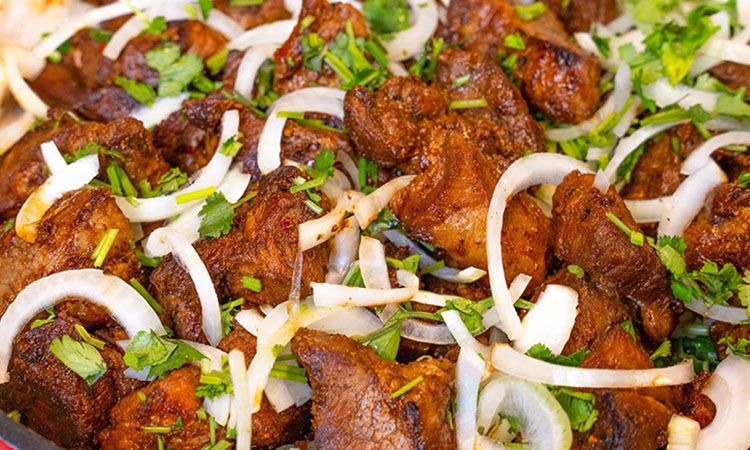 Готовое мясо снимите на блюдо с лавашем, обильно посыпьте свежим луком с зеленью и сумахом, после чего дайте ему отдохнуть под слоем лаваша еще около пяти-десяти минут перед подачей.