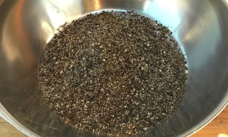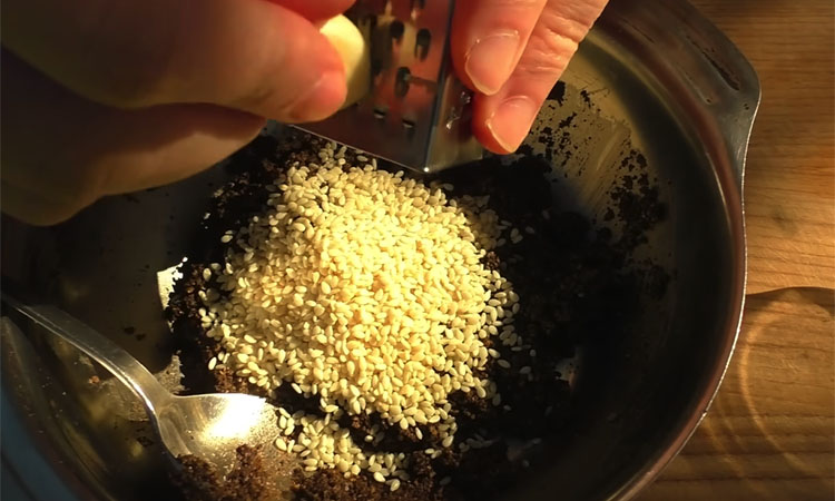 Измельчите черный перец так, чтобы получилась крошка среднего помола, но не пыль. Пересыпьте перец в миску, добавьте молотый кориандр, соль, сахар и влейте по одной столовой ложке воды и соевого соуса. Тщательно перемешайте всё до состояния густой мокрой кашицы. Сверху на смесь выложите ложку кунжута и натрите на мелкой терке чеснок, но пока ничего не перемешивайте.