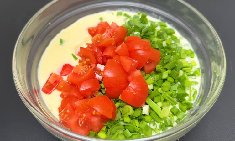 3. Пока запекается картофель, подготовьте заливку. В глубокой миске взбейте яйца со сметаной до однородной консистенции. Помидоры черри разрежьте пополам или на четвертинки в зависимости от размера, а зелёный лук мелко порубите. Добавьте всё это в яично-сметанную смесь и аккуратно перемешайте, чтобы начинка распределилась равномерно.