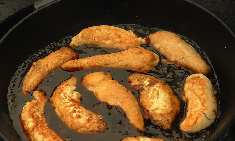 Сначала подготовьте мясо: если у вас целое филе, отделите малую часть или нарежьте грудку на небольшие продолговатые кусочки. Поставьте сковороду на сильный огонь, налейте достаточное количество подсолнечного масла без запаха и хорошо его накалите. Выкладывайте курицу на сковороду небольшими партиями, чтобы мясо жарилось, а не варилось. Обжаривайте буквально по две минуты с каждой стороны до появления уверенной румяной корочки. Каждую готовую порцию мяса перекладывайте со сковороды на сухую бумажную салфетку или полотенце, чтобы полностью избавиться от лишнего растительного жира.