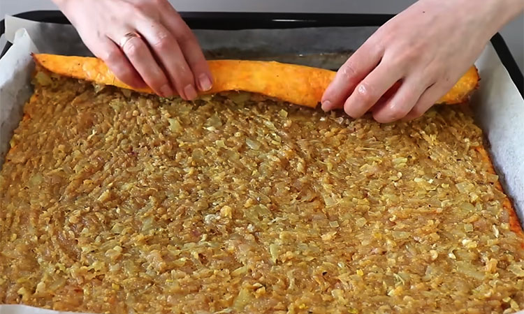 Соедините сыр и морковь с яичной массой, добиваясь равномерного распределения ингредиентов. Застелите стандартный противень размером тридцать на сорок сантиметров качественным антипригарным пергаментом. Смажьте бумагу тонким слоем растительного масла без запаха и выложите подготовленную сырную смесь, разравнивая ее тонким слоем. Поместите противень в разогретую до 180 градусов духовку на десять или двенадцать минут, используя режим без конвекции. Для приготовления начинки мелко нарежьте репчатый лук кубиком и измельчите чеснок.